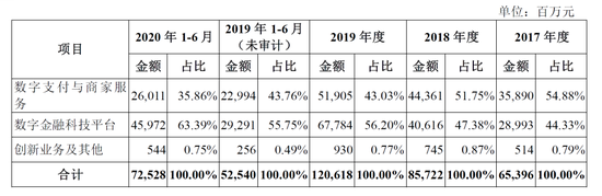 2020年上半年,其数字支付业务收入260.11亿元,占比35.86%;数字金融科技平台收入459.72亿元,占比最高,达到63.39%;创新业务及其他收入5.44亿元,占比0.75%。
