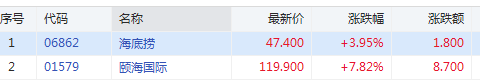 华盛资讯8月26日讯,颐海国际(01579.HK)现涨7.82%,报119.9港元。海底捞(06862.HK)现涨3.95%,报47.4港元。