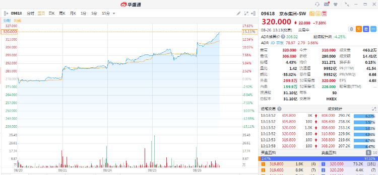 京东港股涨势如虹,目前大涨逾7%,上市两个半月市值激增3000亿港元。