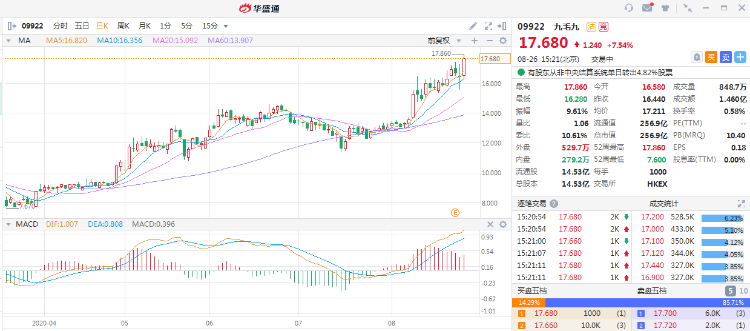 智通财经APP获悉,九毛九(09922)尾盘涨幅扩大逾8%,高见17.86港元,刷新历史新高,截至15时21分,涨7.54%,报价17.68港元,成交额1.46亿。