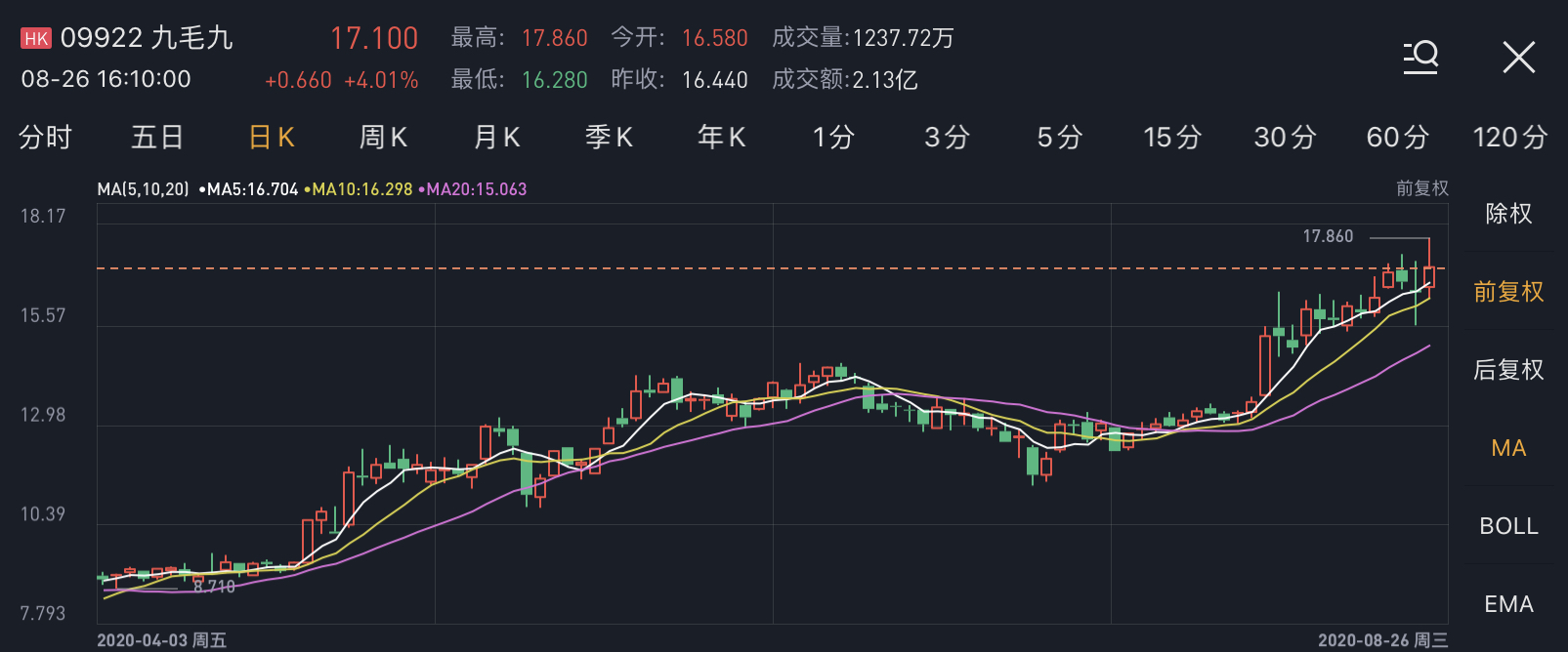 中金发表研究报告表示,九毛九上半年业绩亏损8590.2万元人民币。中金公司认为,九毛九上半年业绩和之前公司发布的亏损指引大致相符,考虑到太二品牌当前的快速复苏以及在公共卫生事件中能够获得更好的门店营业位置的机会,上调公司目标价至20港元,维持“跑赢行业”评级。