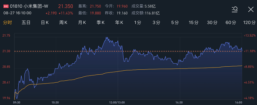 发布靓丽财报后,小米股价次日暴涨!截至8月27日收盘,小米集团-W涨11.43%,报21.35港元,当前总市值达到5147亿港元,创历史新高!