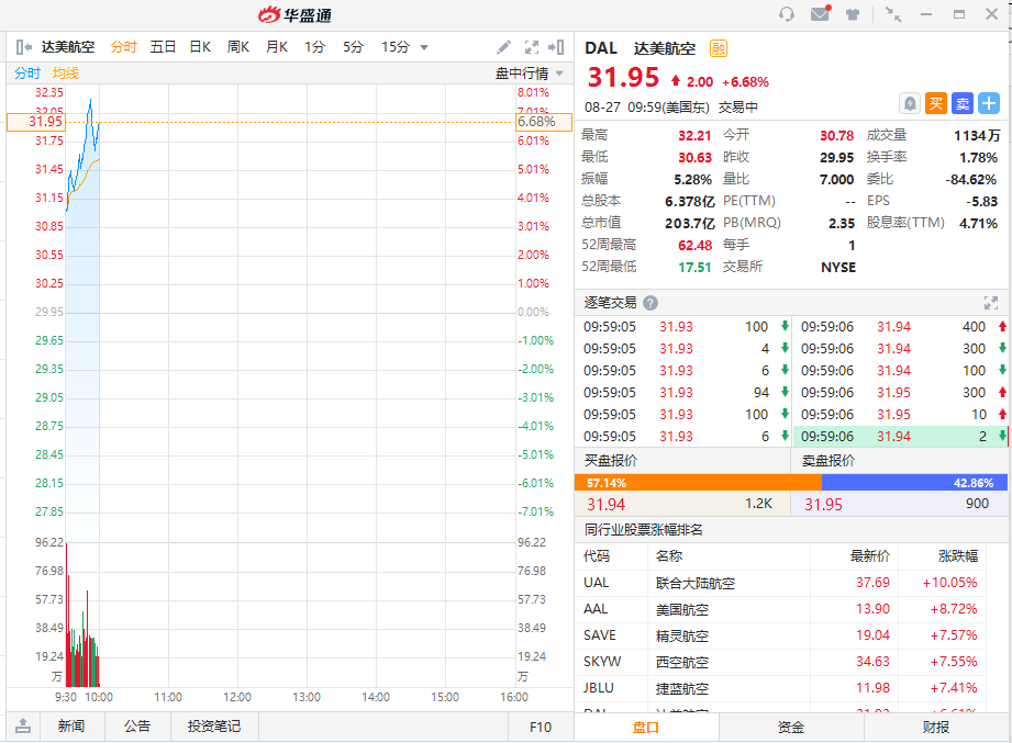 华盛资讯8月27日消息,今日美股航空股集体上涨,美国航空涨超8%,联合大陆航空涨超9%,达美航空涨超6%,波音涨超3%。