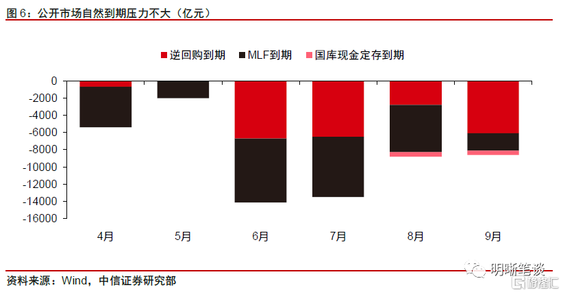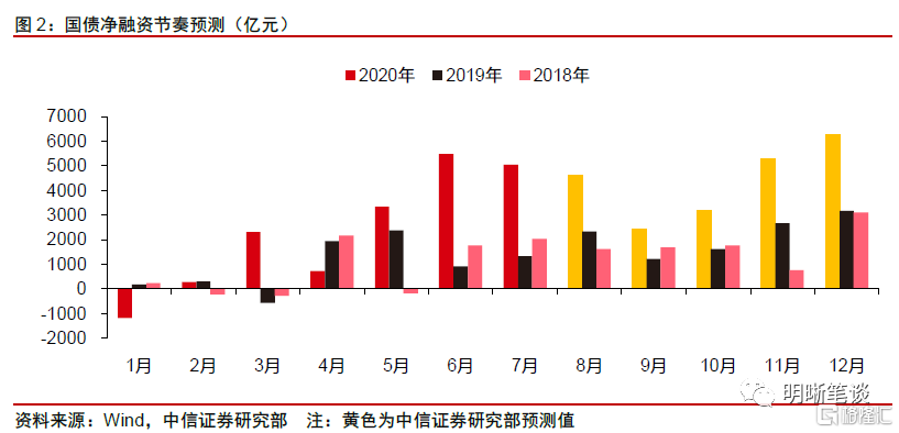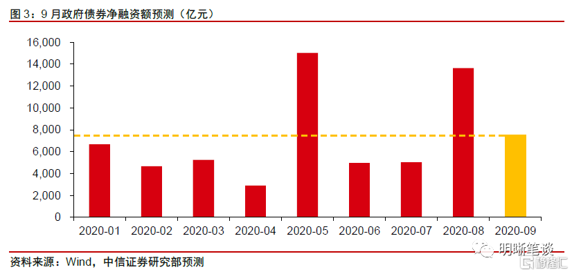 考虑到9月份国债的到期量为3500亿元左右,在发行压力较大的假设下,9月的国债净融资额估计在2500亿元左右。