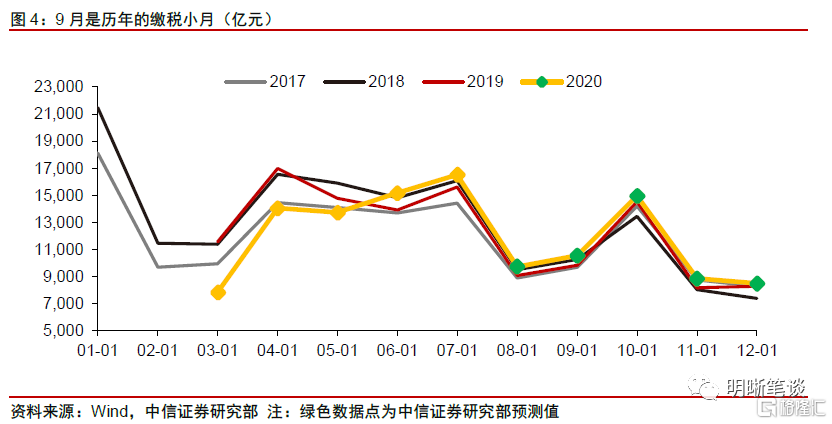 9月是历年的缴税小月,预计缴税压力不大。从税收的季节性特征来看,9月历年来都是缴税的小月,占全年税收的比重仅为6.5%左右(过去三年平均)。从季节图表中我们也可以看到,过去三年中下半年税收节奏的一致性要远好于上半年,确定性也更强。因此,我们通过估计2020年下半年的总税收,并按照过去三年的平均比例分配给每个月份,来估计9月份的税收压力。考虑到税收收入与名义GDP的相关性,2020年下半年税收的同比增速按照5.5%来保守估计(2020年6、7月份的税收同比增速已经恢复至9.0%和5.7%),那么,9月的缴税额约为1万亿,后续各月估计值如下图所示。