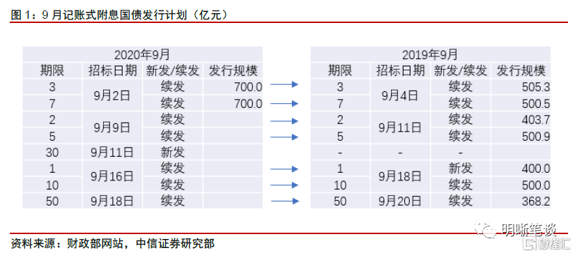 2、贴现国债和储蓄国债:对比8月份的发行结果,9月贴现国债和储蓄国债也可能有所增发,分别估计增加700亿元和320亿元。