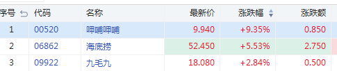 华盛资讯8月28日讯,餐饮行业今日大涨,呷哺呷哺(00520.HK)现涨超9%,报9.94港元。海底捞(06862.HK)现涨5.53%,报52.45港元,股价续创新高。九毛九(09922.HK)现涨2.84%,报18.08港元。