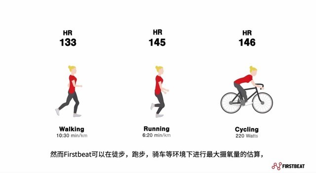 Garmin在自家产品线中运用Firstbeat 的创新分析技术已有十多年,每天有成千上万的Garmin 用户在使用其智能手表或自行车码表上的Firstbeat Analytics 数据,包括最大摄氧量(VO₂max)、训练状态/负荷、训练效果、效益指标、乳酸阈值、完赛预估、恢复时间、EPOC、卡路里燃烧、呼吸作用、压力、睡眠等数据。Firstbeat在其中扮演的角色就是基于心率和心率变异性这些变量,以及一个人的基本生理特征(年龄、性别、身高、体重),再结合运动本身的一些数据(例如距离、时间、配速等),将这些数据经过专利的算法处理后,通过上述指标和数据给出科学而且直观的建议和评估。