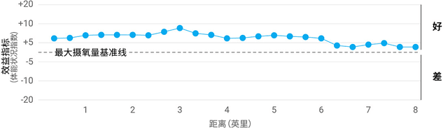 若要即时评估你目前的体能状况,效益指标是最直观的表现。这项数据是以你的最大摄氧量为基准线所预估的即时偏差值,正向数字越大说明运动状态越好,可适当增加运动量;反之则考虑减轻运动量,让身体得以休息恢复。