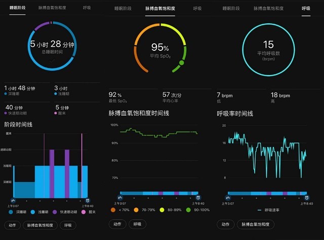 目前,几乎所有的Garmin手表都支持这项功能。在具备呼吸监测和血氧监测功能的表款中,睡眠监测报告还会加入睡眠期间的呼吸率和血氧浓度这两项数据,这对于呼吸疾病或身体异常的预警有一定的参考意义。