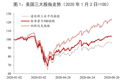 3 月 24 日,道琼斯工业指数上涨 11.37%,创 1933 年以来最大单日涨幅;6 月 10 日,纳斯达克指数突破 10000 点,创历史新高;8 月 17 日,标准普尔和纳斯达克指数分别创收盘价新高,美国股市反弹幅度和速度超出市场预期。截至 8 月 27 日收盘,道指已基本收复今年跌幅,纳指和标普500指数创出历史新高,较年初分别还上涨了29.56%和7.85%。
