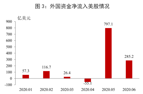 同时,在全球范围内疫情大流行与货币大宽松共同作用下,国际资金开始回流美股。各类主体回撤资金、增持美元后仍不得不选择重新配置到美股市场。根据美国财政部 8 月国际资本流动报告(TIC),经过 4 月净流出 55 亿美元后,5 月外国投资者净购入美股 797 亿美元,创历史新高,6 月美股继续净购入 285 亿美元。