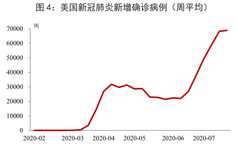 美国仍是全球疫情最严重的国家,近期新增病例处于每日 5-7 万例高位,多地单日新增病例增幅刷新纪录,20 多个州暂停经济重启。