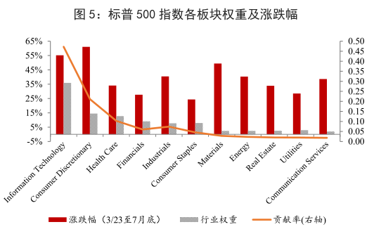 在标普 500 指数中,信息技术和医疗保健板块市值权重较大,分别占比 35.9%和 12.7%,而这两个板块受疫情冲击较小甚至有所提振,按权重计算,二者对标普 500 指数的上涨,贡献率超过一半。