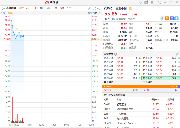 8月28日(周五)美股盘初,截至22:34,百胜中国(YUMC.US)涨1.18%,报55.85美元。