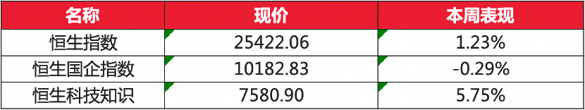 港股方面,恒生指数上周涨1.23%,报25422;恒生科技指数上周涨5.75%,报7580;国企指数上周跌0.29%,报10182。服饰配件及皮革,新能源材料涨幅居前,零售、电视广播跌幅居前。