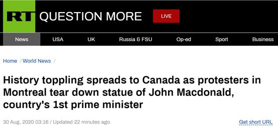 RT:随着蒙特利尔示威者推倒加拿大第一任总理约翰·麦克唐纳的雕像,历史的倒塌蔓延至加拿大