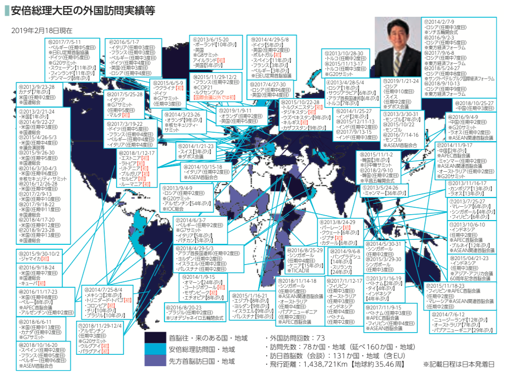安倍在任期间,访问了80多个国家,累计出访170多次,是日本历史上出访最多的首相。