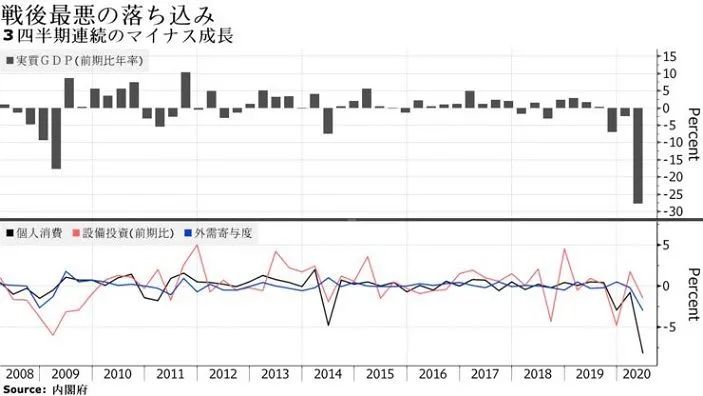 7月份,日本经济产业省公布了2020年第二季度日本GDP数据,环比年化增长率为-27.8%,为二战之后最糟糕的表现。