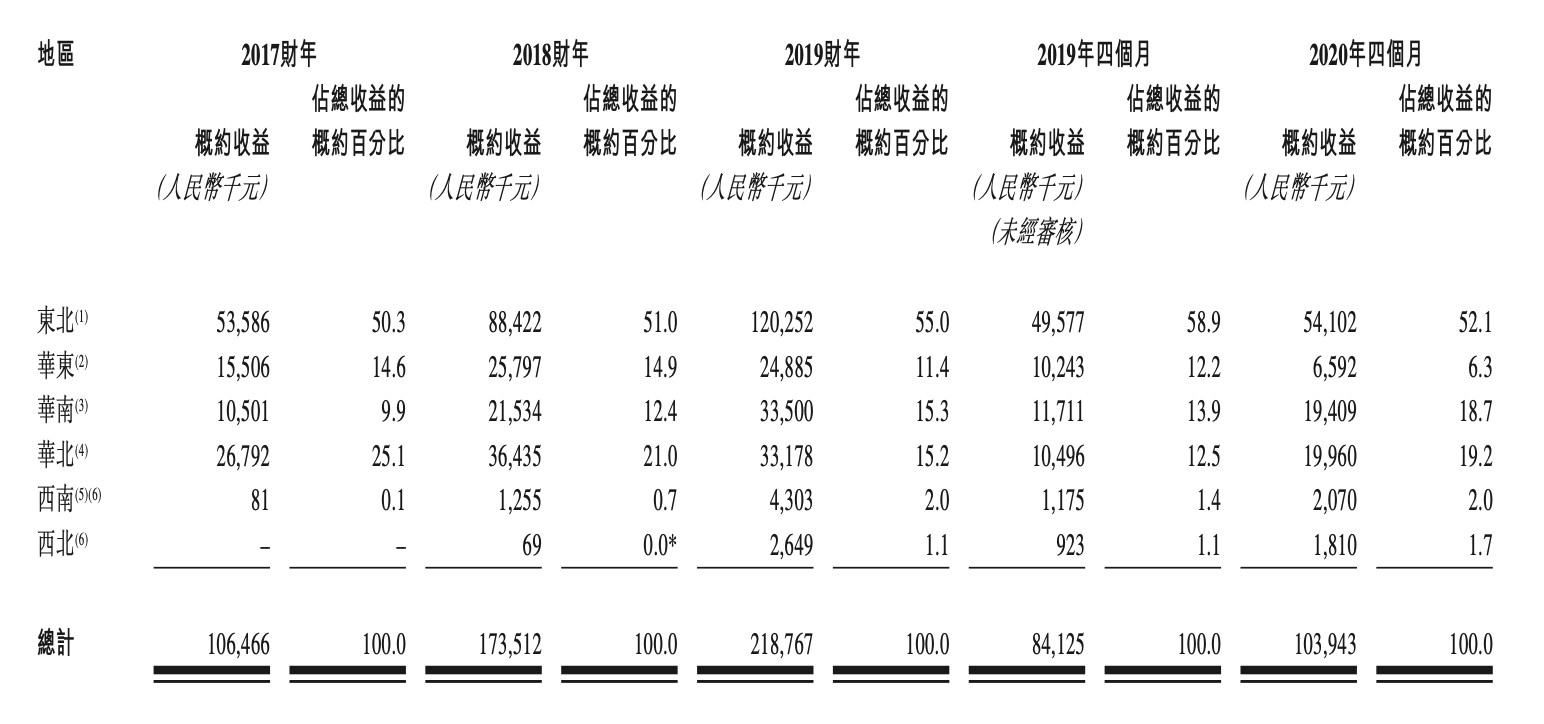 于往绩记录期间,东北为该公司贡献逾50%的收益。公司正逐步发展华东及华南市场,这两个地区产生的总收益由2017财年的约2600万元增至2019财年的约5840万元。