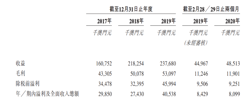 财务数据方面,集团2017财年至2019财年总收益分别为1.61亿、2.18亿及2.38亿澳门元,年复合增长率21.6%,净利润分别为2985万、2743万及4053.8万澳门元,年复合增长率16.5%。