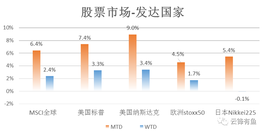上周,全球股市总体上扬。美国股市集体收高,纳指和标普500指数连涨5周后再创新高,其中标普500上涨3.3%,纳指上涨3.4%。欧洲股市扭转势头,上涨1.7%。A股市场震荡上升,上周大涨5.6%。港股仍处于调整期,小幅上涨1.3%。