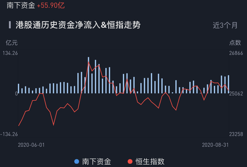华盛资讯8月31日讯,南下资金今日净流入港股55.90亿港元,流入规模维持在历史高位。