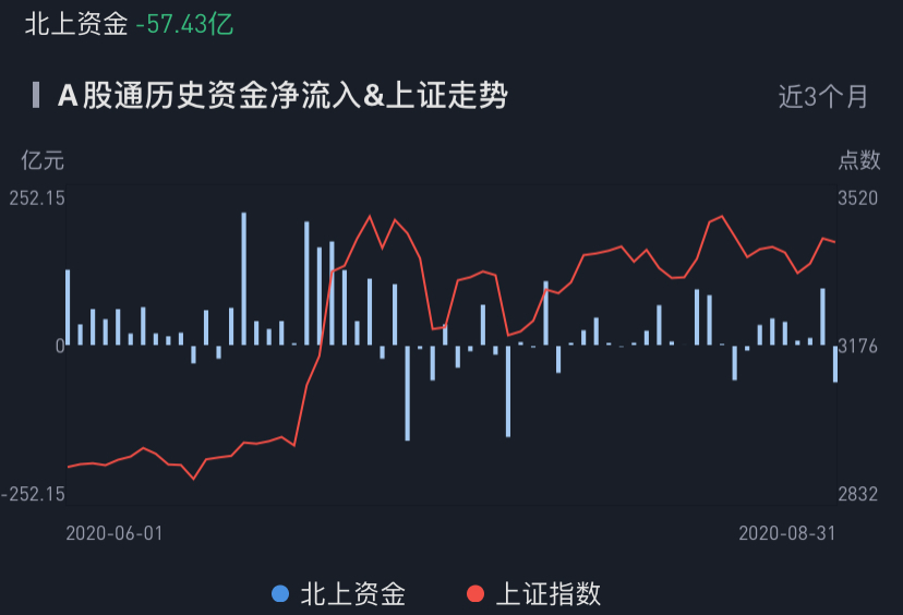 北上资金今日大幅净流出A股57.43亿元,由大幅流入转为大幅流出。