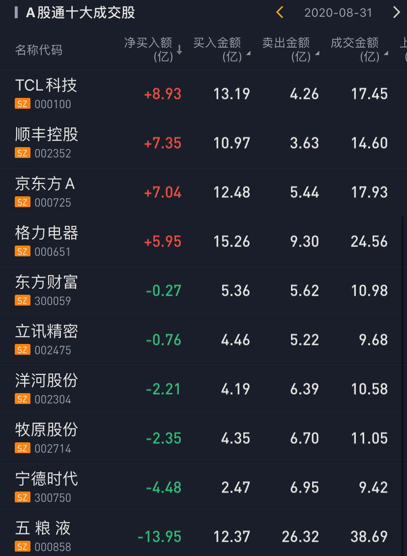 北上资金今日净买入TCL8.93亿元,净买入顺丰科技7.35亿元,净买入京东方A7.04亿元,净买入格力电器5.95亿元。