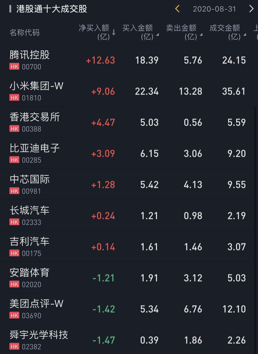 个股方面,今日南下资金净买入腾讯控股12.63亿港元,净买入小米集团-W9.06亿港元,净买入香港交易所4.47亿港元。
