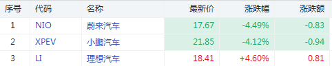 周一,三只新能源中概股涨跌互现,理想汽车开盘大涨近5%,结束连续上周连续两日的跌势;蔚来汽车股价继续受挫跌4.49%,此前公司宣布增发;小鹏汽车结束上市两日以来上涨,跌4.12%。