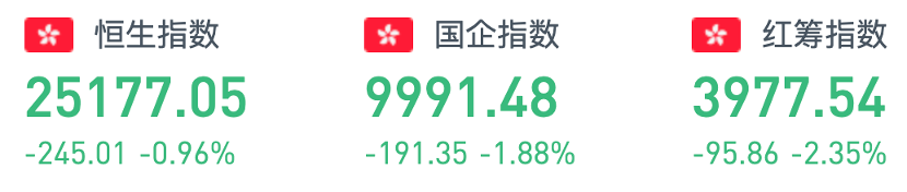 周一,恒生指数收盘下跌245.01点,跌幅为0.96%,报收25177.05点;国企指数收盘下跌191.35点,跌幅为1.88%,报收9991.48点;红筹指数收盘下跌95.86点,跌幅为2.35%,报收3977.54点。南向资金当日净流入48.92亿元。