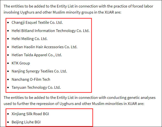 7月20日,美国商务部工业和安全局(BIS)宣布将11家中国公司加入“实体清单”。被加入实体清单的11家就包括南昌欧菲光科技有限公司、华大基因等知名企业。此前包括华为、海康威视、浙江大华等企业也被美方列入“实体清单”。