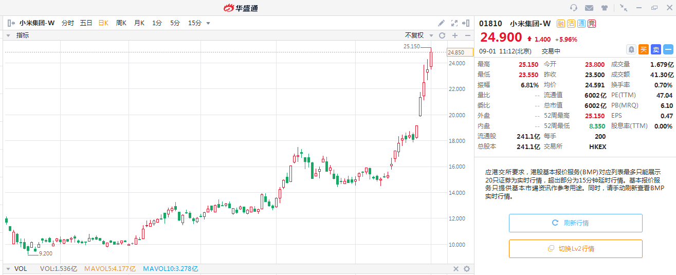 受到替代华为提升市场份额,以及海外销售业绩增长出色,我国另一家手机巨头小米集团近期股价表现强势,自3月20日以来最大区间涨幅超170%,9月1日早间股价一度站上25.15港元历史新高。