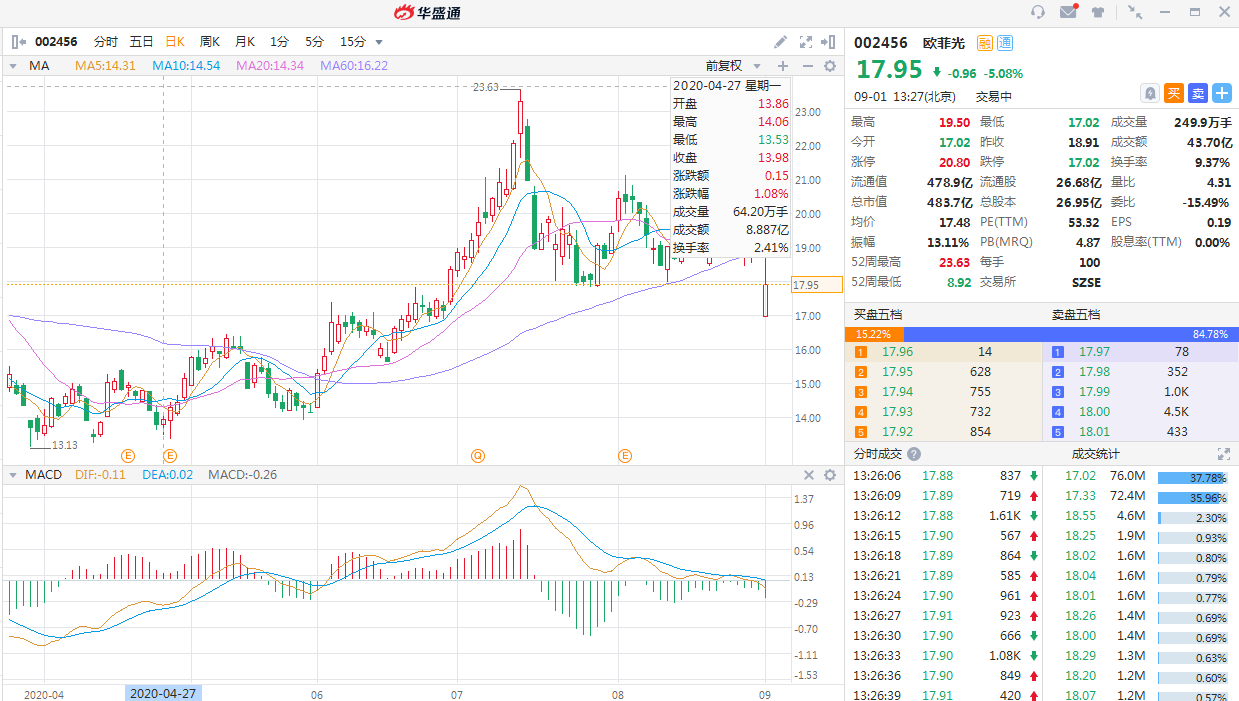 受负面消息影响,欧菲光股价开盘就被砸至跌停,不过澄清公告发布后,跌幅收窄。