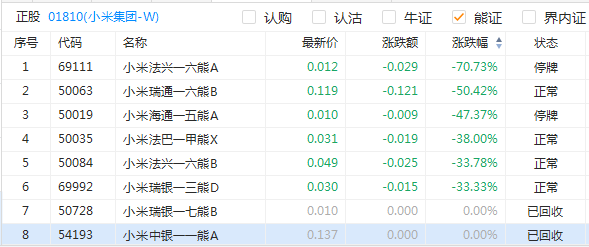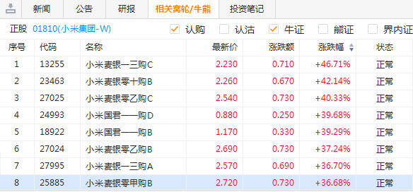 而做多小米的牛证和认购窝轮则连日暴涨,截至发稿,小米麦银一三购C为今日涨幅最高的小米认购窝轮,现涨46.71%。