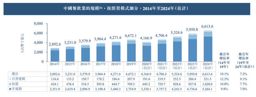 中国餐饮业有巨大的发展机会,2019年的人均食物开支约为每日人民币16.4元,而美国则为每日人民币102.6元。尽管中国餐饮业于2020年受到新冠肺炎疫情爆发影响,但预期行业会复苏并持续强劲增长,由2019年至2024年以约7.2%的复合年增长率增至人民币66136亿元,主要由家庭可支配收入上升、城市化率提高、外卖服务增长强劲及中国市场的数字化平台及科技发展所带动。