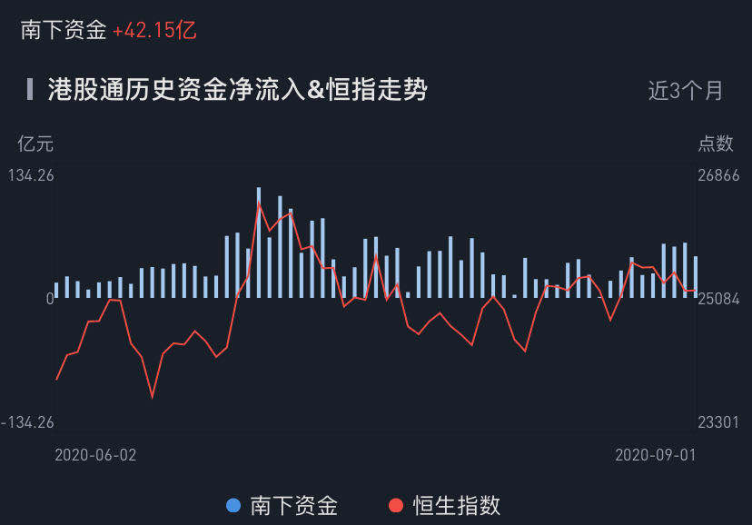 华盛资讯9月1日讯,南下资金今日净流入港股42.15亿港元,流入规模略微下滑,但仍维持在历史高位。