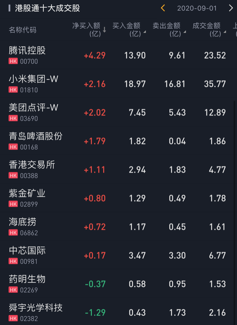 个股方面,今日南下资金净买入腾讯控股4.29亿港元,净买入小米集团-W2.16亿港元,净买入美团点评-W2.02亿港元。