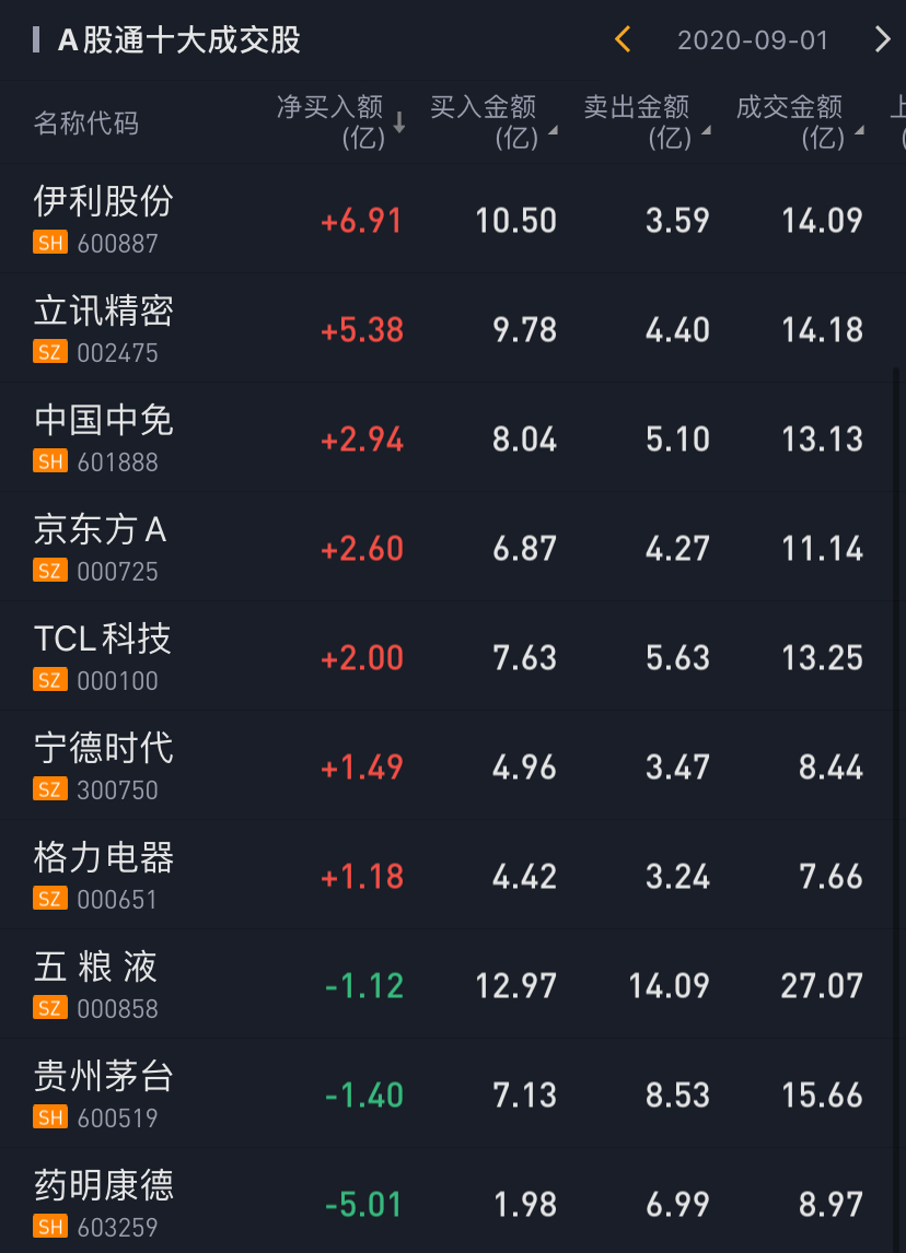 北上资金今日净买入伊利股份6.91亿元,净买入立讯精密5.38亿元,净买入中国中免2.94亿元,净买入京东方A2.60亿元。