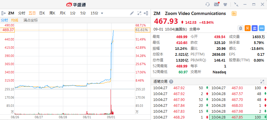 华盛资讯9月1日讯,视频会议软件开发商Zoom股价大涨43.94%,此前公司发布的二季度财报超出市场普遍预期,并上调了全年业绩指引。