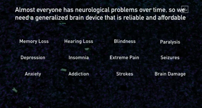 按照他们公司的宣传,Neuralink 的目的是实现人机共生。马斯克在发布会上说,未来人人都可以在脑部植入一个芯片,“解决从记忆力丧失到听力丧失、失明、瘫痪、抑郁、失眠、极度疼痛、焦虑、成瘾、中风、脑部损害等一系列问题”。