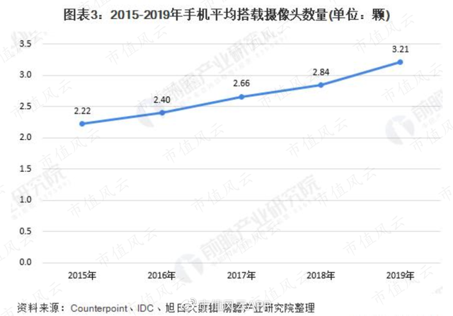 另外根据前瞻产业研究院的数据,每台手机平均搭载的摄像头数量已经从2015年的2.22个上升至2019年的3.21个。