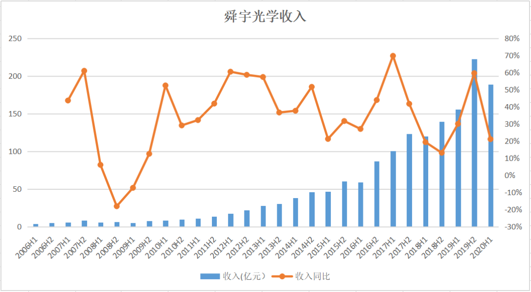 纵观舜宇光学过去的增长,可以说一直是一个优等生。从2010年上半年以来,舜宇光学的收入增速基本保持在20%以上,只有在2018年手机行业整体增速下降,舜宇光学收入增速才跌破20%。而在疫情笼罩的上半年,舜宇光学的收入增长依然保持在20%之上,其实颇为坚挺。