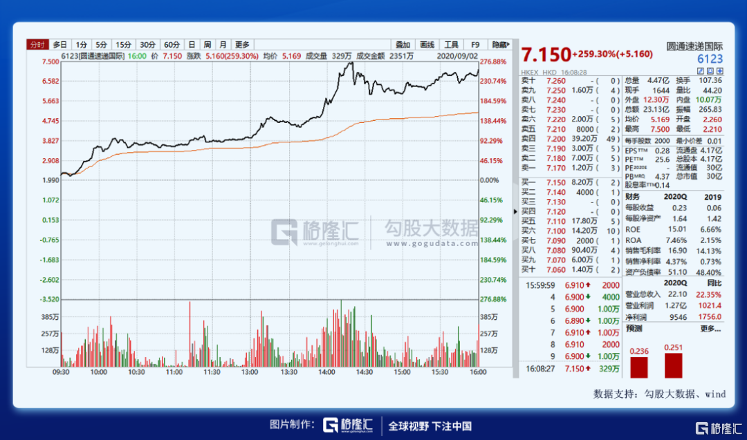 今天,圆通速递A股尾盘涨停,而港股的圆通速递国际更是大涨259%,盘中一度触及7.5的高点。有分析认为,公司将来有望承接阿里的海外速递业务。