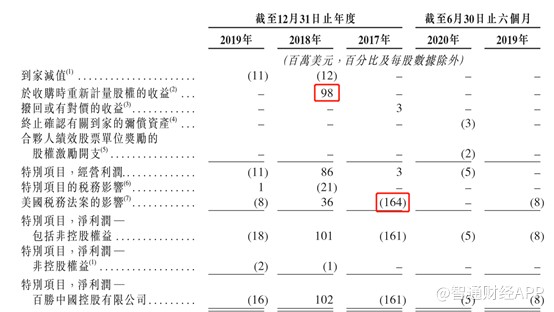 2018年百胜中国业绩大增,主要是因为两方面,一是公允价值变动导致利润增加9800万美元;二是美国税法案调整回3600万美元。2017年百胜中国因为税法案亏损1.64亿美元,2018年百胜中国税法案挽回3600万美元损失,一正一负之间,两者相差2亿美元。剔除这两部分的影响,2018年百胜中国净利润同比增长3.97%。