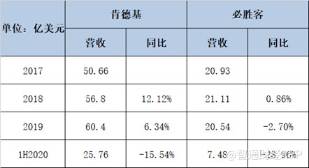 数据显示,肯德基营收增速从2018年的12.12%下降至2019年的6.34%,业绩增速出现放缓的迹象。必胜客2018年基本上没有增长,2019年便出现了负增长。