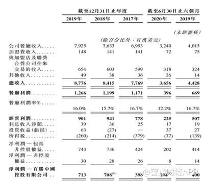 再看利润。过去三年百胜中国的餐厅利润率约16%左右,2017年-2020年前6个月,百胜中国净利润分别为4.03亿美元、7.08亿美元、7.13亿美元以及1.94亿美元;同比增长分别为-19.72%、77.89%、0.71%以及-51.5%。