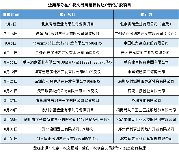 不仅是保利与华润置地,从不同产权交易所近期的公告看,包括金茂、中国电建、招商蛇口等国有资本均有陆续开展项目公司股权转让或增资扩股的工作。