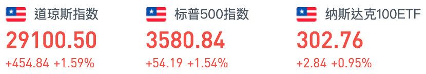 美股周三收高。道指收复29000点关口。纳指史上首次站上12000点,携手标普500指数共创历史新高。美国8月ADP就业人数增加42.8万远逊预期。道指收盘上涨454.84点,或1.59%,报29100.50点;纳指涨116.78点,或0.98%,报12056.44点;标普500指数涨54.19点,或1.54%,报3580.84点。